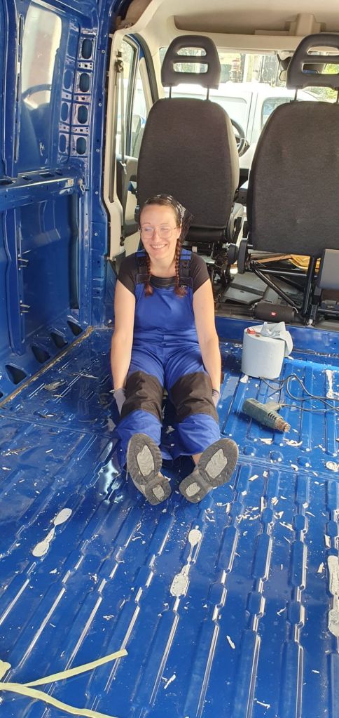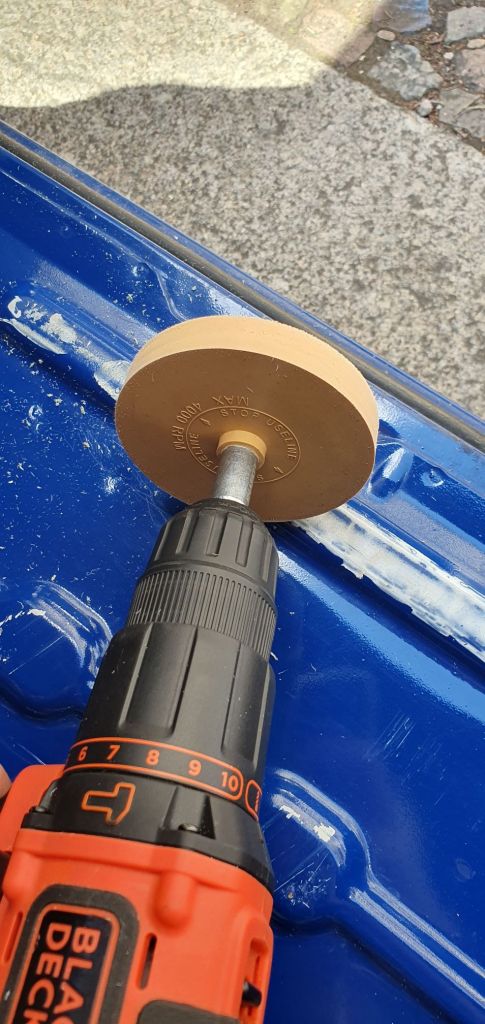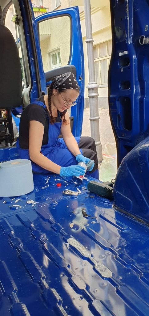 Mit dem Glasschaber geht’s los – sämtliche Reiniger scheinen auch trotz Einwirkzeit erfolglos. Dafür kommt gegen 14 Uhr endlich die per Express bestellte Gummischeibe und sie funktioniert! Eine Bohrmaschine haben wir leider nicht, deshalb muss der Akkuschrauber ran. Wie zu erwarten, wird der aber irgendwann heiß. Zeit für eine Pause und los zum Lackzenter.