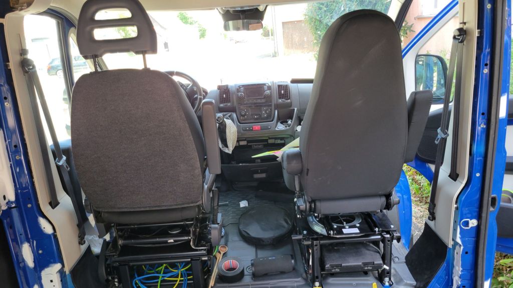 Dort, wo wir die Sitzbank haben einbauen lassen, haben wir auch Drehkonsolen und einen Einzelsitz gekauft. Nachdem wir die Drehkonsole am Fahrersitz moniert hatten, mussten wir leider feststellen, dass der Sitz nun viel zu hoch ist. Ein neues Sitzgestell hatten wir zwar mitbekommen, aber es war das falsche. Diese wurde zum Glück recht schnell per Post ausgetauscht. Mit dem niedrigen hat es dann geklappt und den hohen konnten wir für den neuen Beifahrersitz nehmen, da dieser eine andere Drehkonsole ( leider hässlich) und einen niedrigeren Sitz hat. Zum Glück hatte die Zweiersitzbank keine Sitzplatzerkennungsplatte. So können wir einfach die Gurtpeitschen vom alten Sitz an den neuen montieren und die überflüssige unterm Sitz befestigen, bis der eine Sitzplatz ausprogrammiert wird (wenn das dann so einfach geht*). So gibt’s dann auch keinen Airbagfehler.